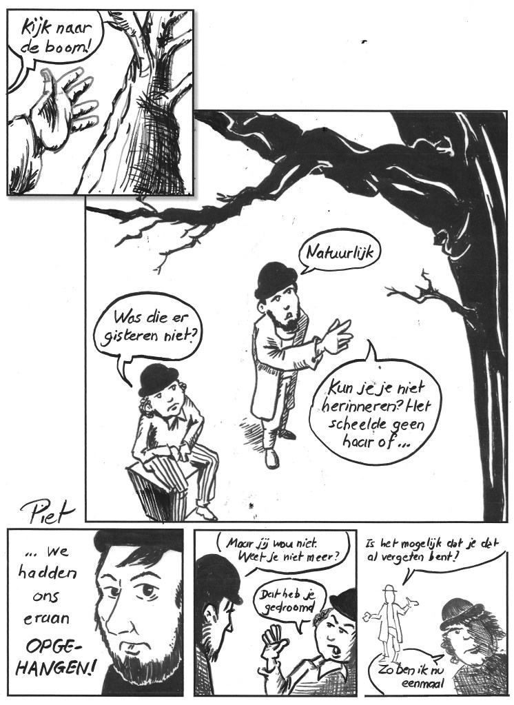 Assignment: find a passage from Waiting for Godot that is as meaningless as possible and adapt it into a comic strip. The challenge is to keep an absurd dialogue between two characters visually engaging, despite the lack of any significant visual setting or interesting story arch.