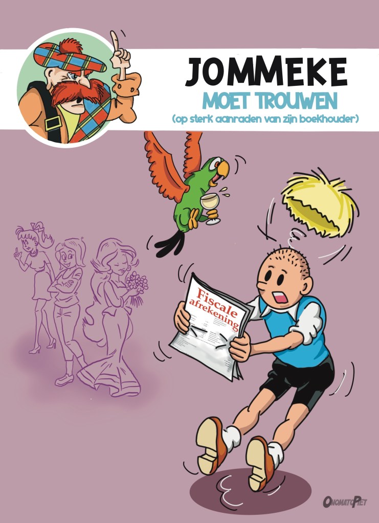 Challenge: a tribute to the timeless classic Flemish children’s comic hero Jommeke, by drawing the cover of a fictional album, with the set title ‘Jommeke Must Marry’. The first idea was, of course, to show a pregnant Annemieke or Rosemieke (or both :)), or a tribute to those other classic Flemish comic heroes, Suske en Wiske’s, in ‘De Briesende Bruid’. But in the end, I opted for an interpretation that could only have sprung from the mind of a small business owner: Jommeke has to marry because of fiscal reasons.